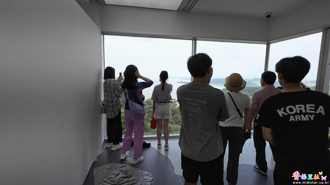 옥상 전망대에서 망원경을 통해 북한땅을 볼 수 있는데 논에서 일하는 사람들을 볼 수 있었다.