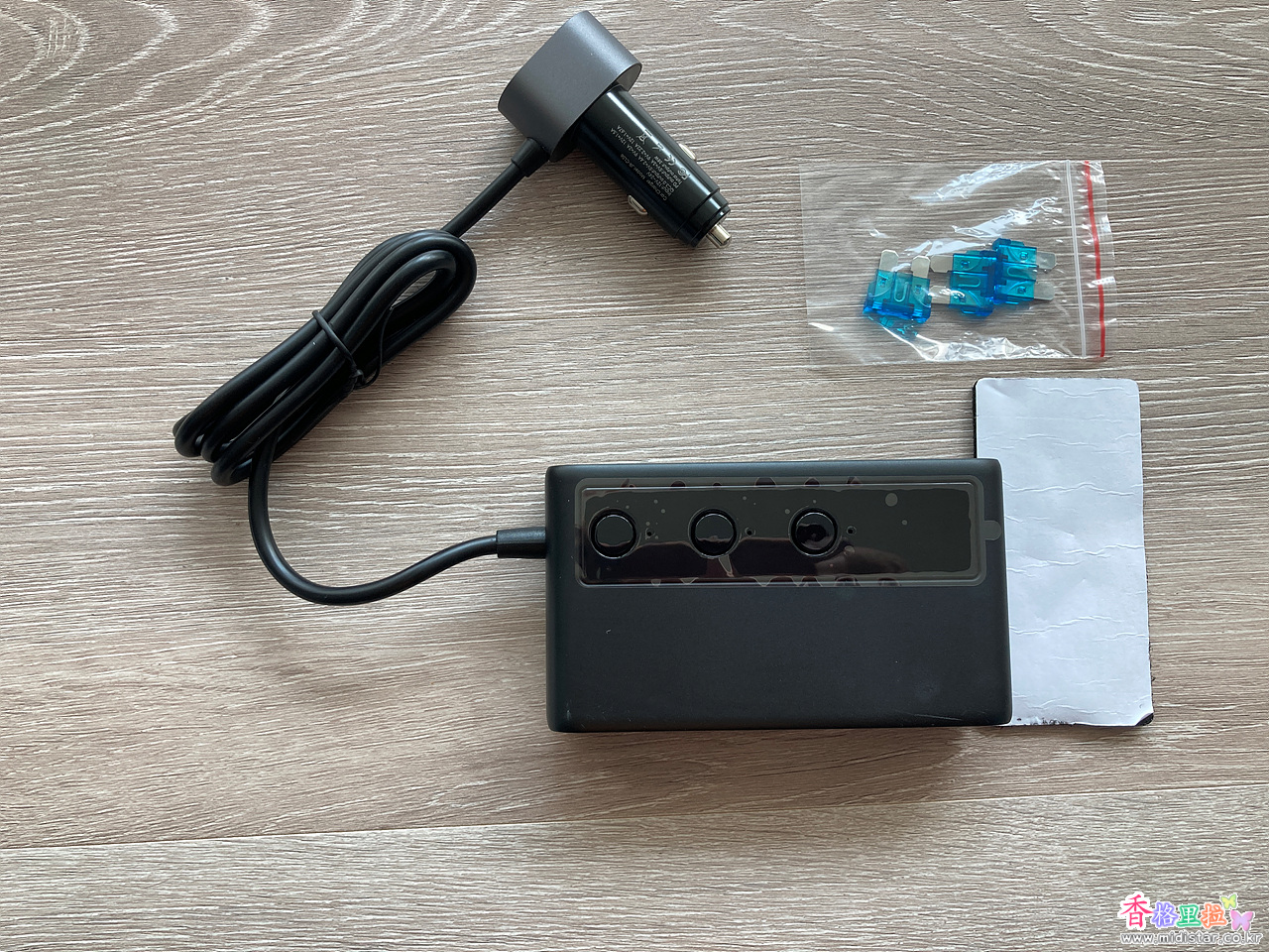 본체, 예비휴즈(3개), 일명 찍찍이 접착테이프가 들어있다.