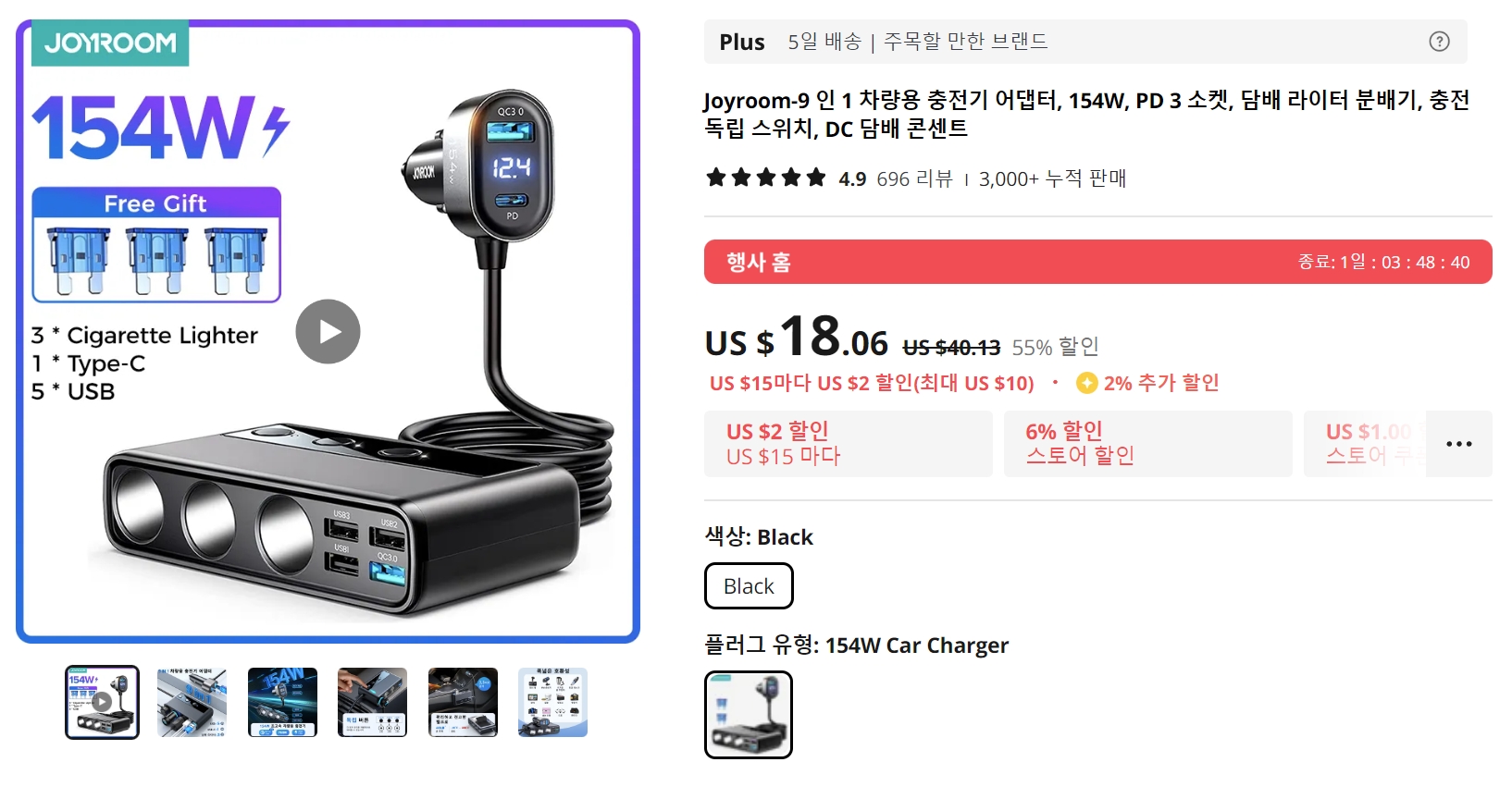며칠 전 구입한 OBDPEAK T20 Carplay Monitor의 차량 연결용으로 3구 Joyroom Mult-port Car Cigarette Lighter JR-CL06을 구입했다.