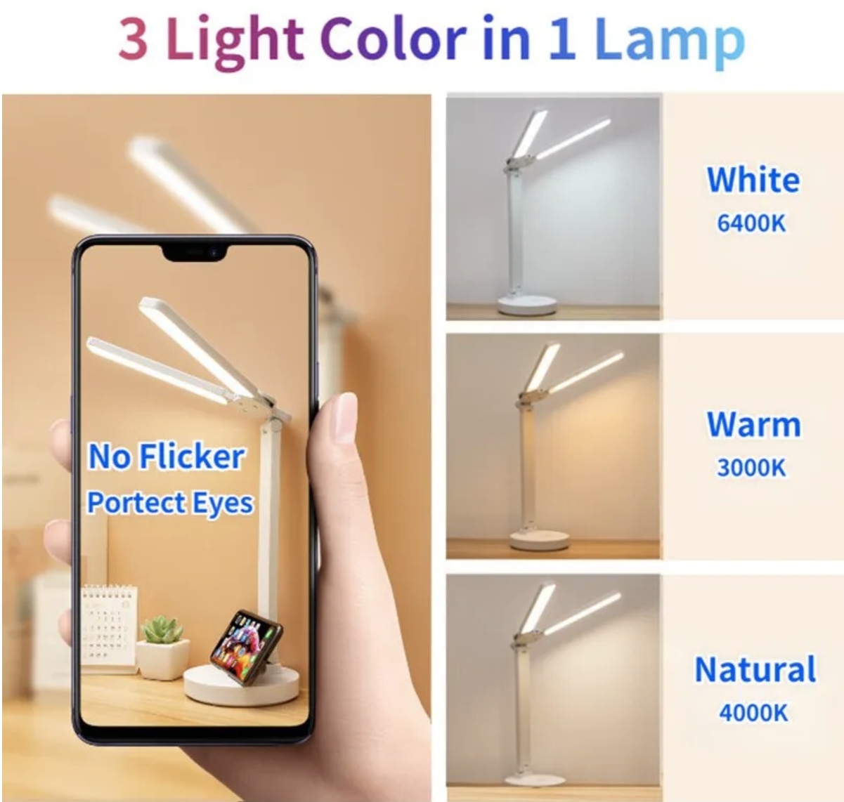 가운데 스위치의 터치로 색상을 3가지 색을 선택할 수 있는데 White 6400K 흰색, Natural 4000K, Warm 3000K를 선택할 수 있다. 그런데 6400K 와 4000K의 차이를 못 느껴서 2가지 색인 것 같다.