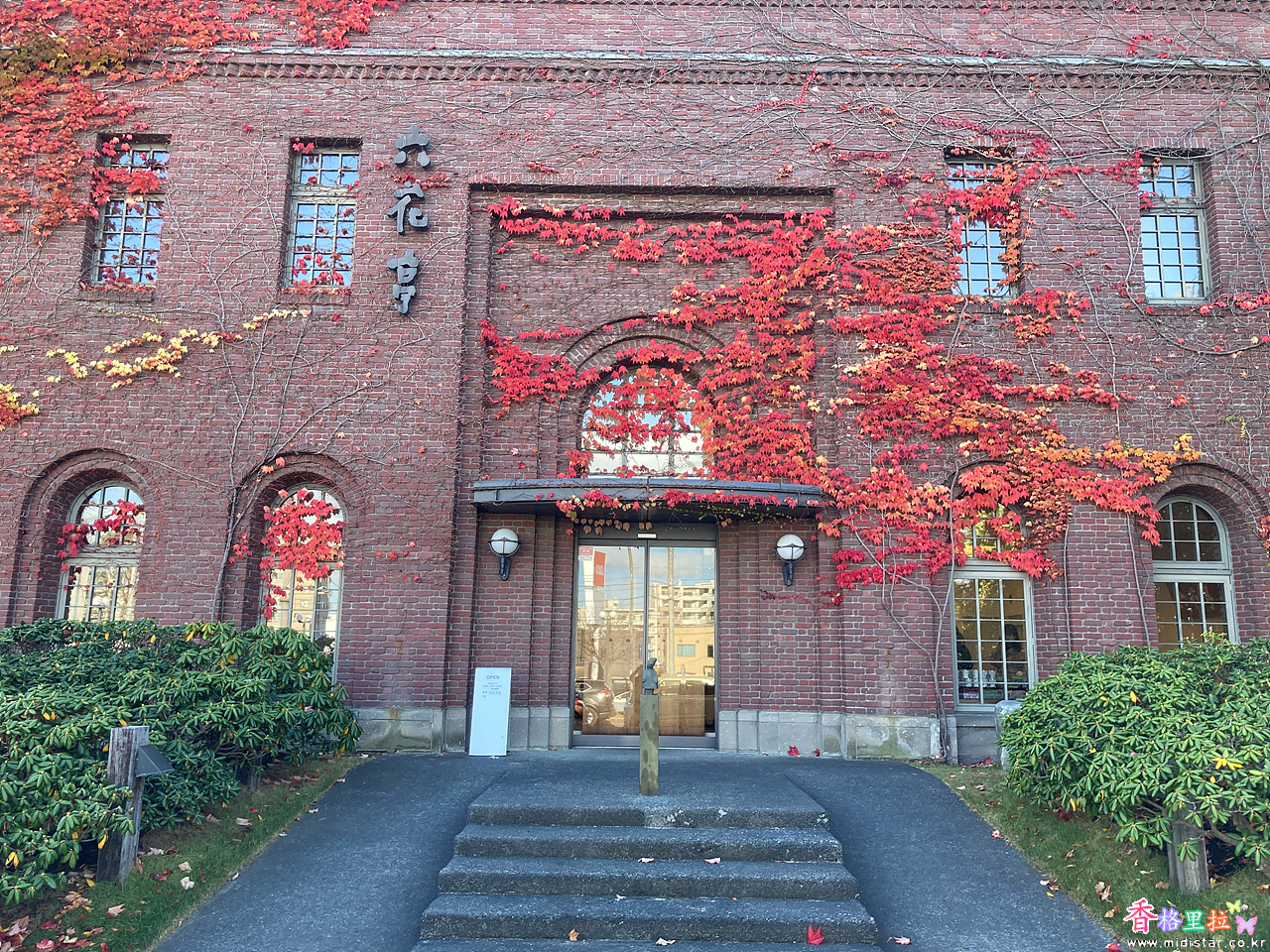 붉은 벽돌 건물에 담쟁이덩굴잎이 붉게 물들어 건물을 돋보이게 한다.