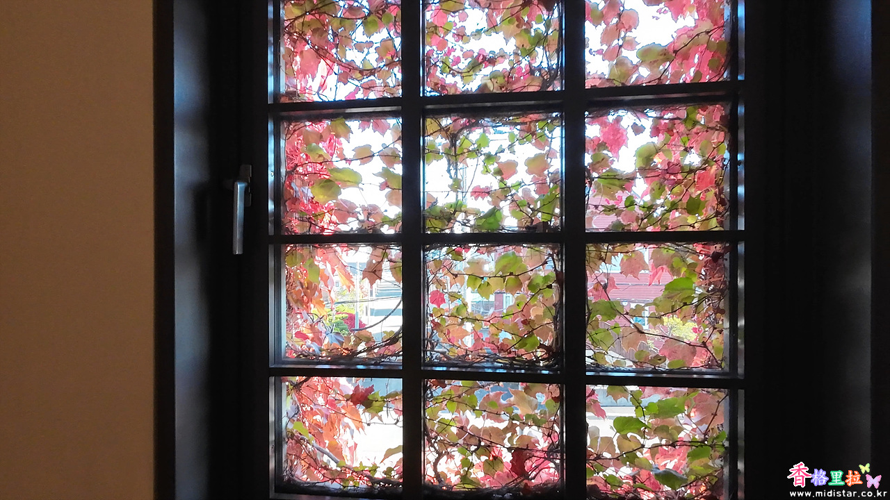 붉게 물든 담쟁이덩굴이 뒤덮은 창문이 감성적으로 다가온다.
