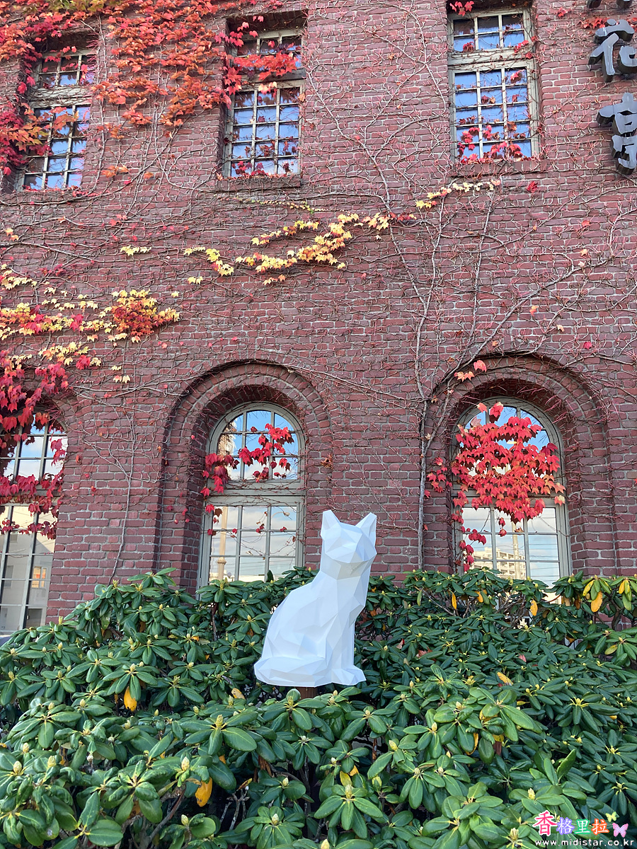 붉은 벽돌 건물에 담쟁이덩굴잎이 붉게 물들어 건물을 돋보이게 한다.