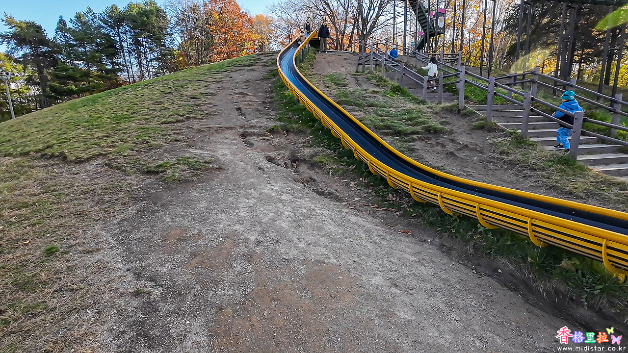 아이들이 좋아하는 제법 높이가 있는 미끄럼틀인데 몇 번을 타야 그만둔다고 한다.