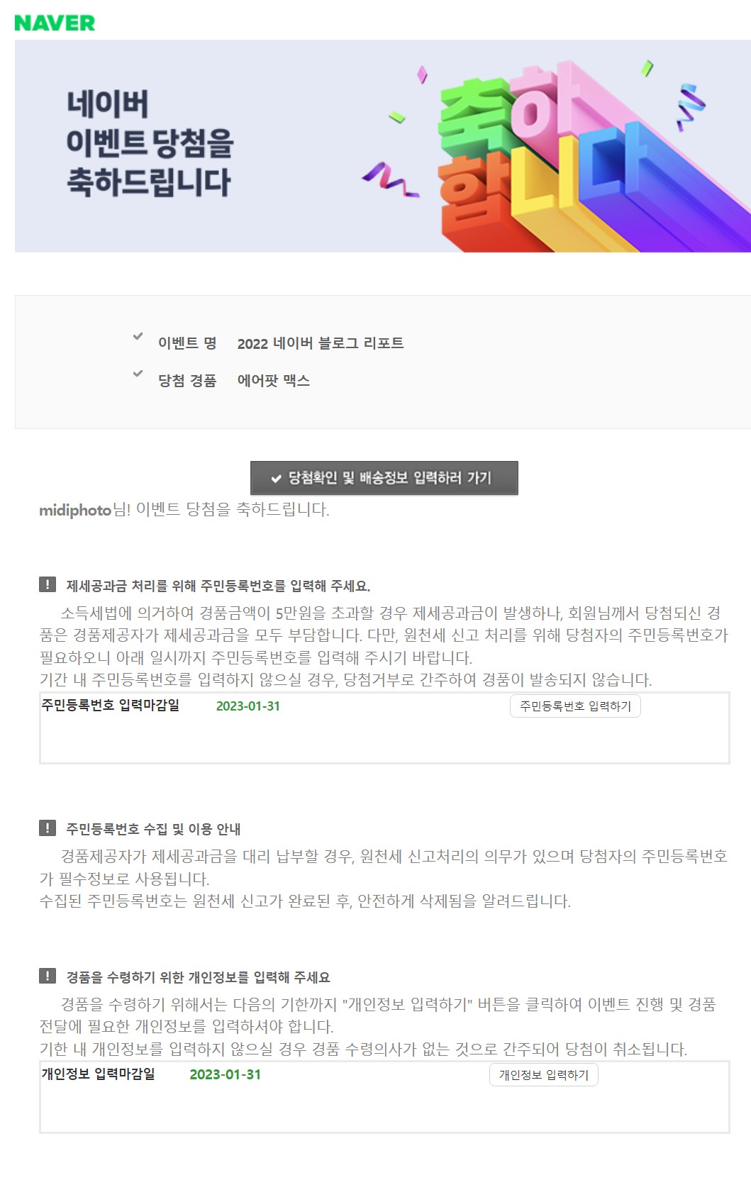 처음엔 피싱메일인줄 알고 긴가민가 했었다. 주민등록번호를 입력하기를 망설이다가 확인 후 입력을 했을 정도다.