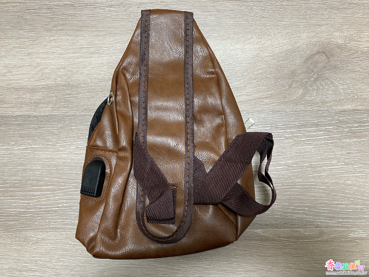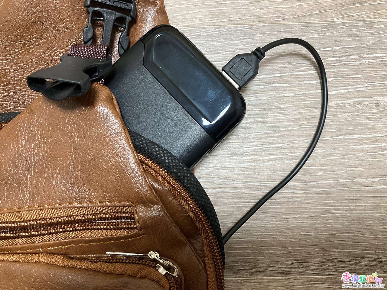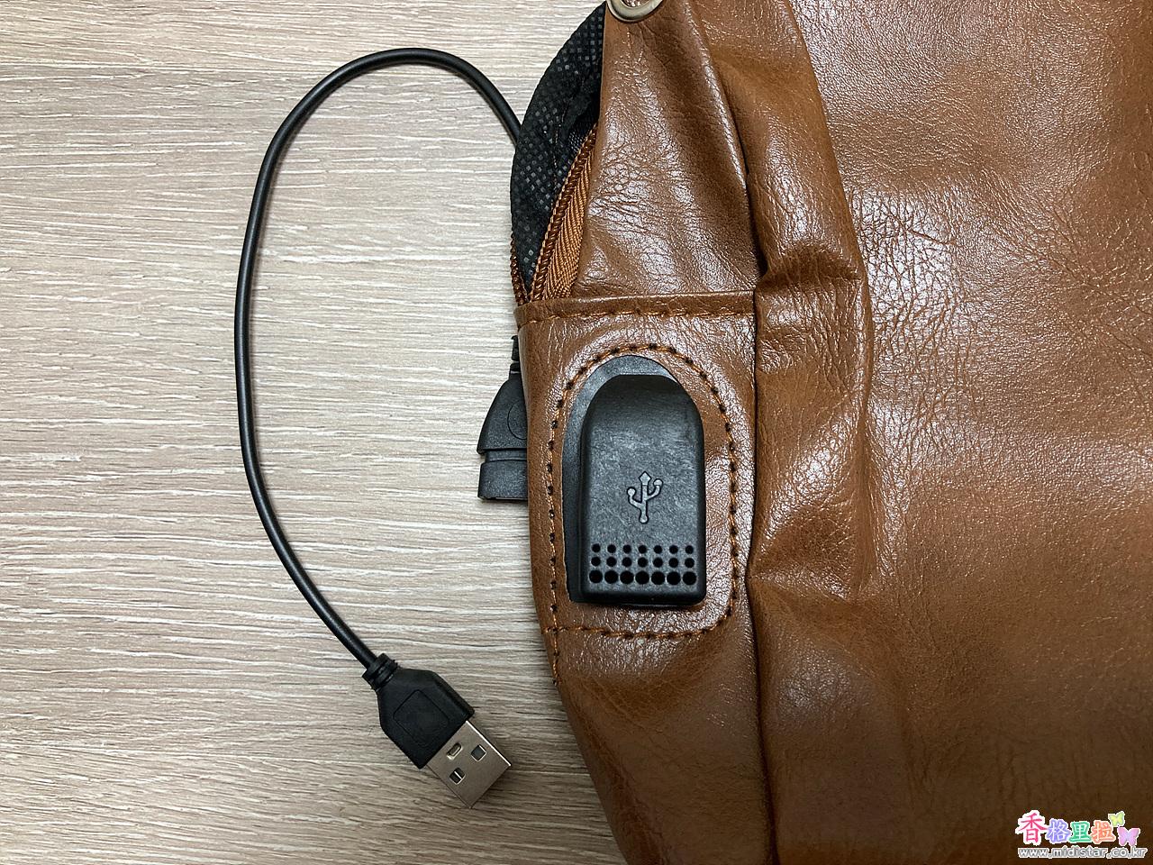 가방 내부에 보조 배터리를 넣어두고 스마트폰을 편리하게 충전하도록 USB 충전단자 홀이 있다.