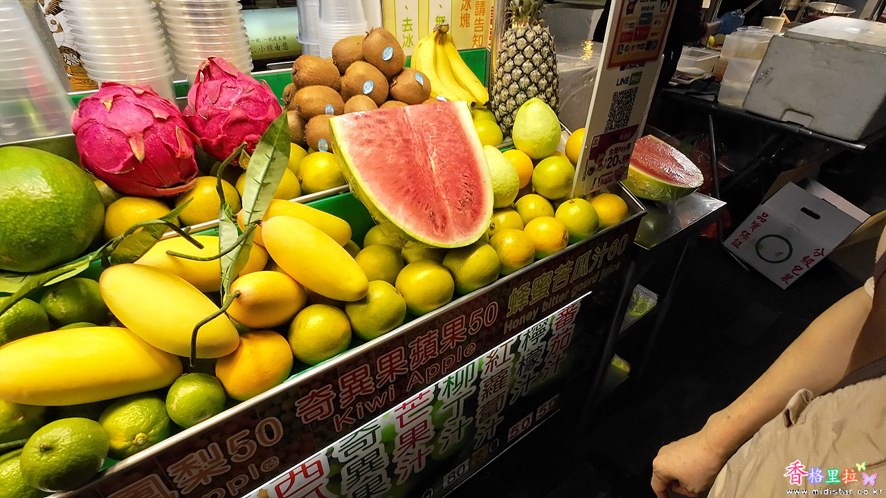 이 가게에서 망고주스 1컵을 50위안에 사서 마셨다.