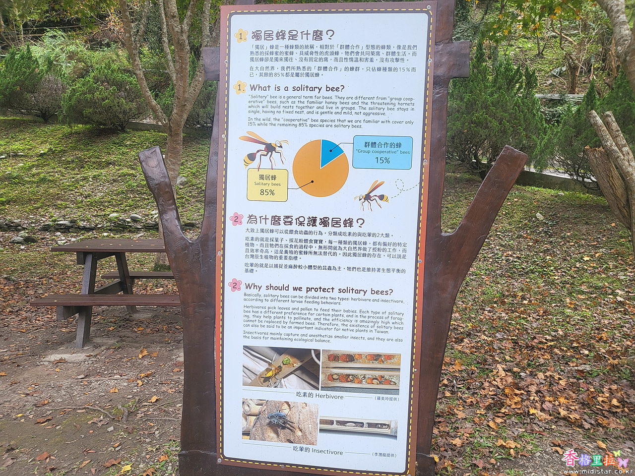 야생벌은 집합체로 생활하는 벌이 15% 이고 나머지 85%는 독거봉(獨居蜂 : Solitary Bees)이라 한다. 그래서 독거봉(獨居蜂 : Solitary Bees)들을 위해 집을 지어 생태를 관찰하는 실험을 하고 있는데 속이빈 둥근 나무를 여러개 꽂아서 벌들의 호텔을 만들어 놓은 것이라 한다.