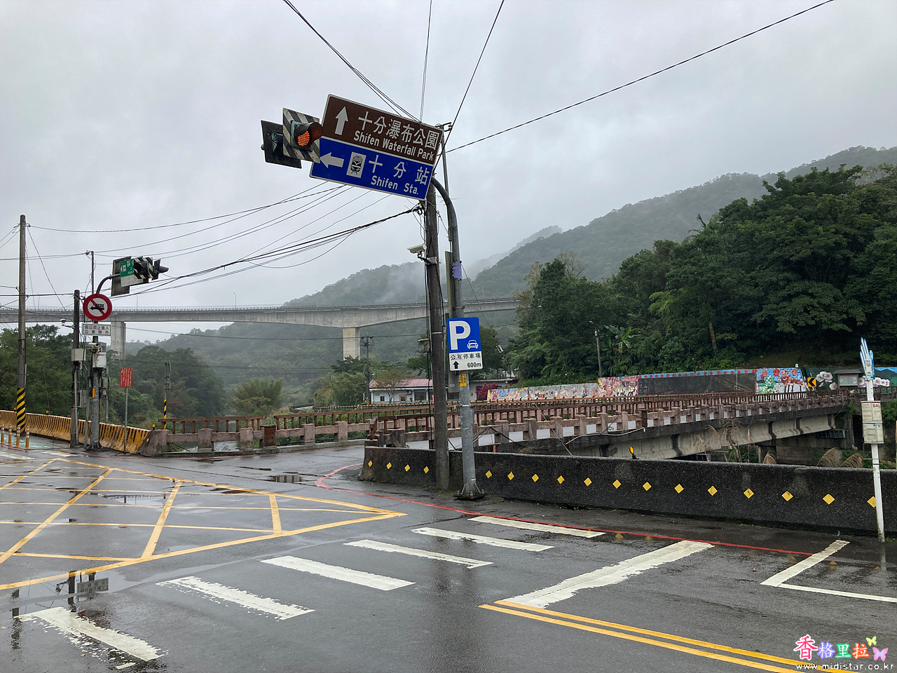 약 55분 걸려 핑시(平溪) 스펀역(十分車站) 앞에 도착, 비가 제법 많이 내린다.