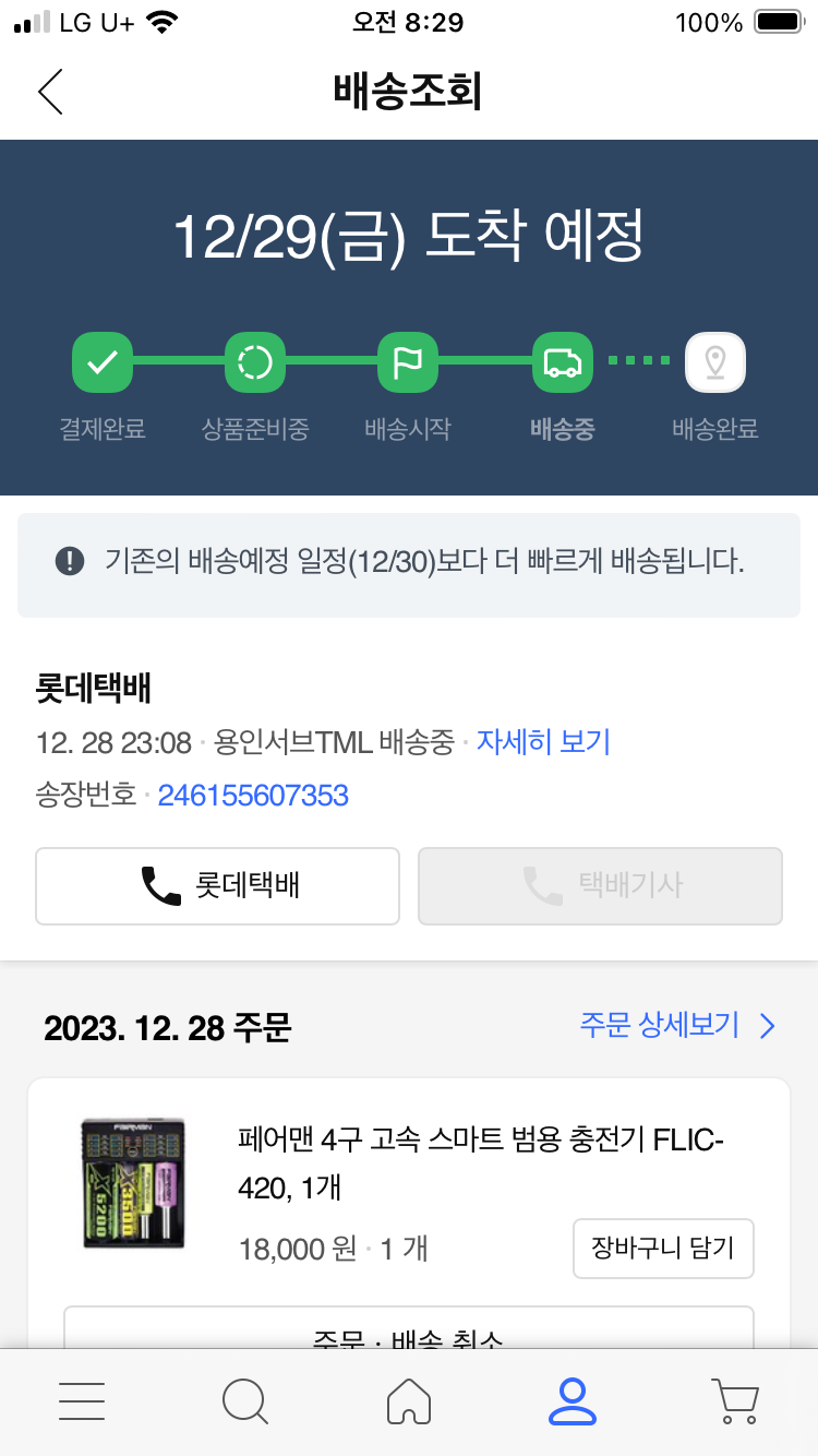 12월 28일 주문할 때 12월 30일(토)까지 배송해 준다 했는데 다음날(12월 29일) 배송통보 문자가 떠서 하루 일찍 받을 거라고 생각했는데 택배가 오지 않았고 다음날(12월 30일)까지 기다려봤지만 감감무소식, 배송정보를 확인해 보니 배송 중에서 머물러 있다. 문의 게시판에 확인 요청을 했는데도 아무 소식이 없다.