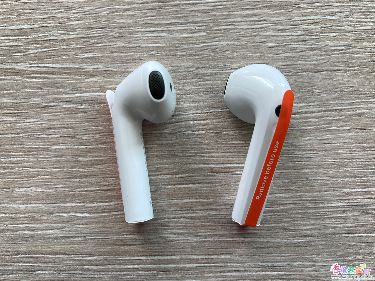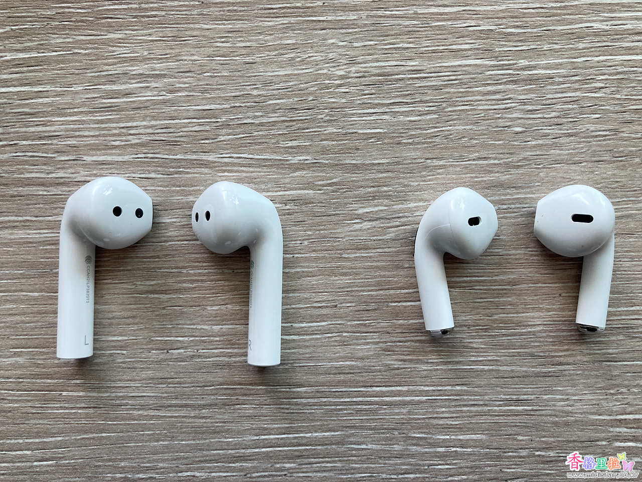 왼쪽이 샤오미 Redmi Buds 3, 오른쪽이 TWS로 샤오미 Redmi Buds 3의 길이가 살짝 길다.