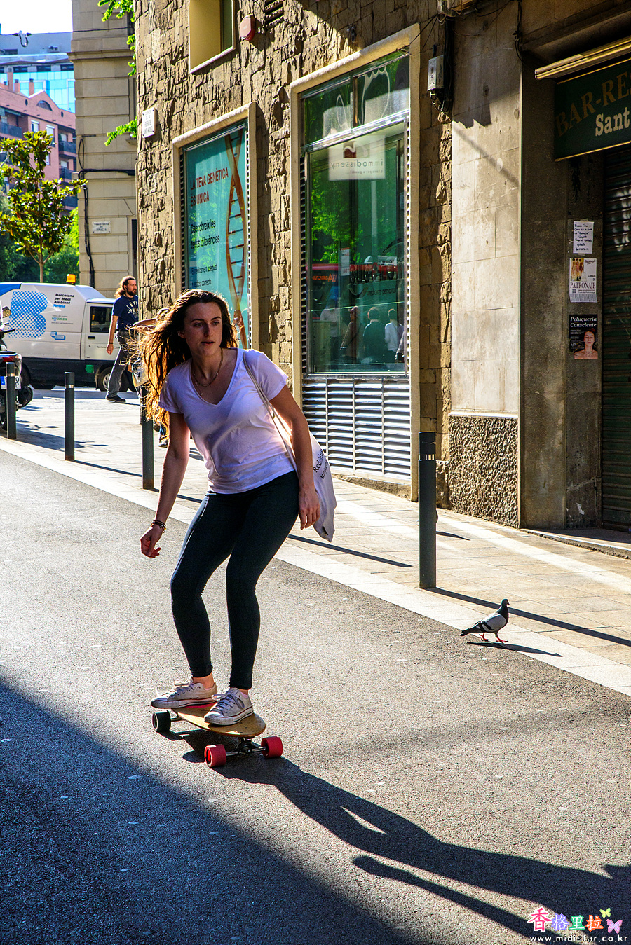 균형잡힌 폼으로 롤러스케이트를 타는 여인