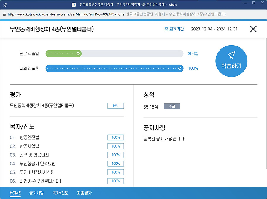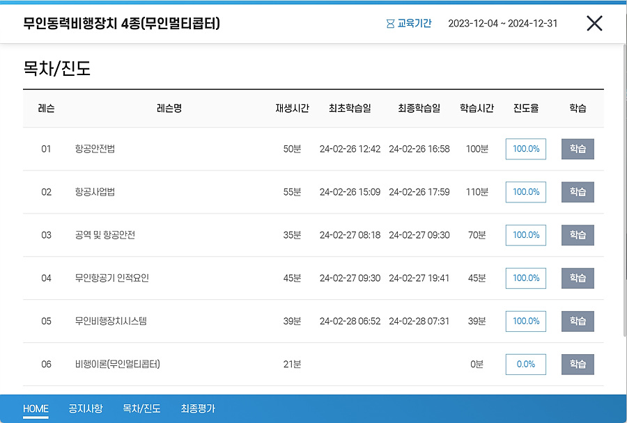 무인동력비행장치4종(무인멀티콥터) 를 선택해서 강의를 들으면 된다.