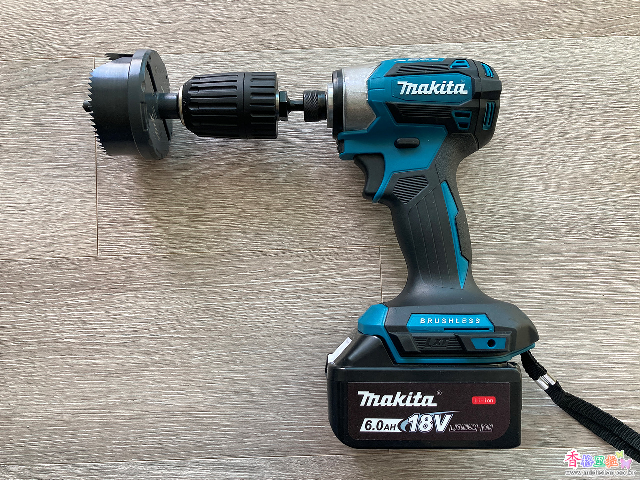 Makita 전동드릴 + 척 + Hole Saw로 책상밑에 구멍을 뚫었는데 순식간에 구멍이 뚫렸다.