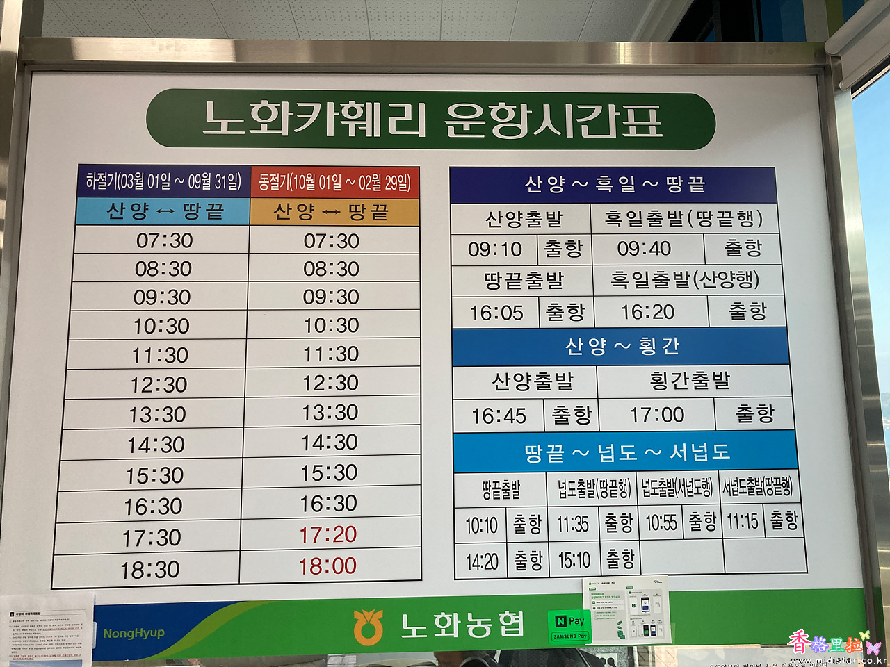 노화카훼리는 땅끝항(갈두항)에서 노화도 산양진항까지 매 1시간 간격으로 운항하고 있었다. 18:30 마지막 배이다.