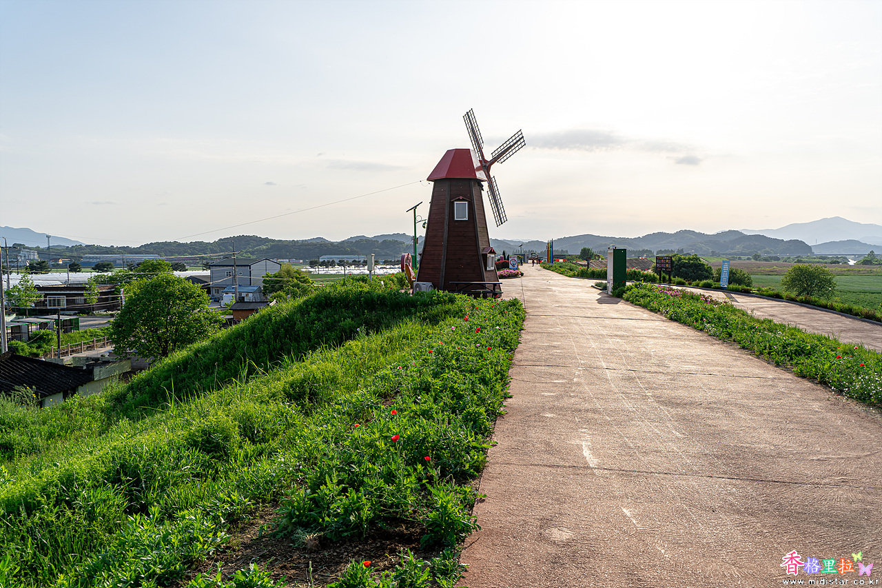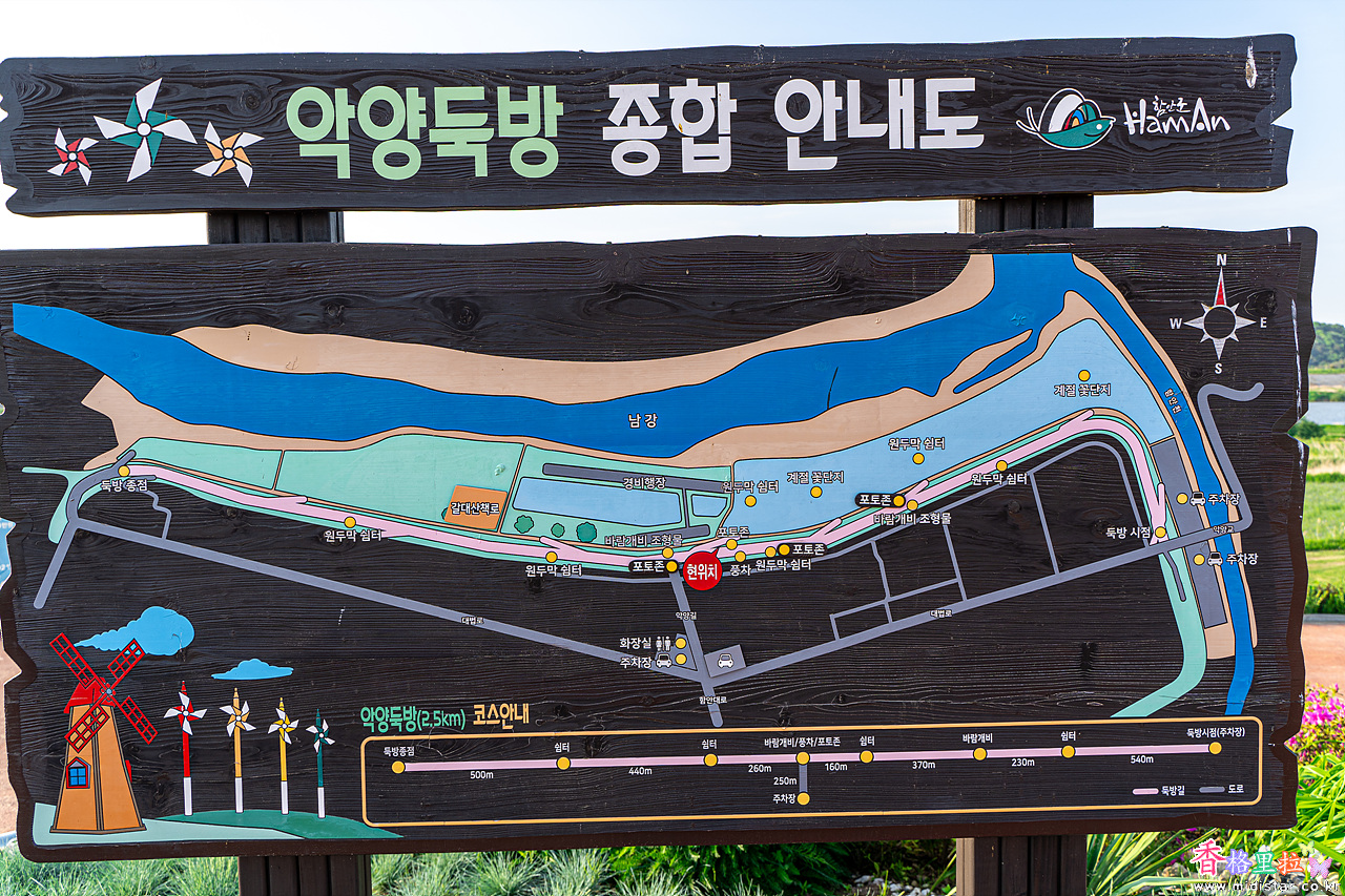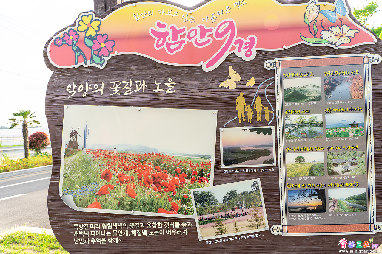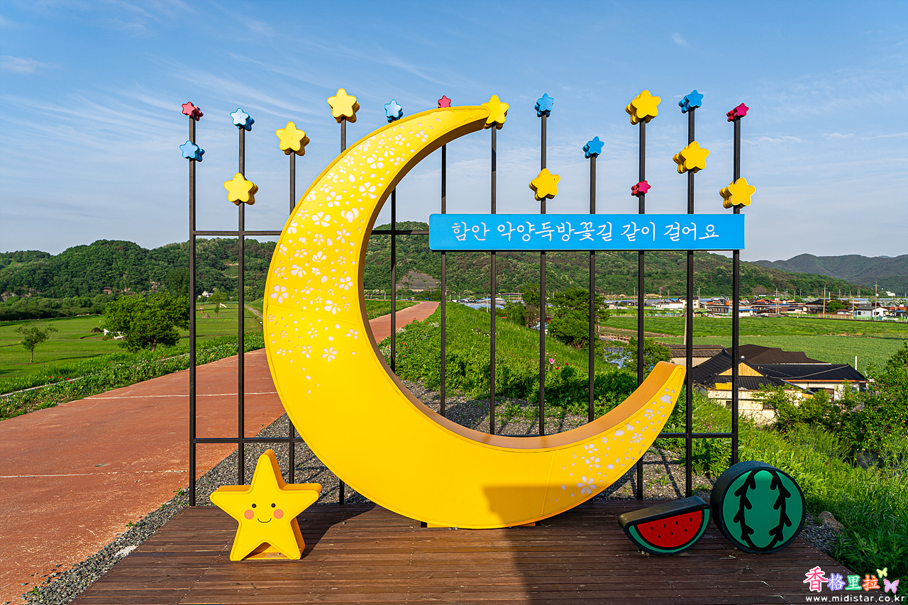 악양둑방은 함안군이 자연재해 방지를 위해 축조한 둑방으로 계절마다 각기 다른 꽃들을 심어 다양한 풍경을 자아내고 있다. 특히 봄에는 흰 안개꽃 사이에 피어난 꽃양귀비가 화려한 자태를 뽐내고 남강의 바람에 물결치는 장관을 연출한다. 둑을 따라 탁 트인 길옆으로 붉은 양귀비가 너울거린다. 중앙에는 국내에서 보기 드문 빨간 풍차가 있고, 날씨가 좋을 땐 꽃밭 위로 날아가는 경비행기를 볼 수 있어 이색적이다. 꽃이 피어 있는 구간의 길이는 2.7km 정도이며, 왕복 소요 시간은 넉넉히 2시간 안팎이다. 둑방 아래에는 함안군을 둘러볼 수 있는 경비행기를 운영하며 남강 너머 기암절벽에는 악양루가 보인다. 악양루는 중국의 명승지인 ‘악양’의 이름을 따서 지은 정자다. 마을 북쪽 절벽에 있으며 유유히 흐르는 남강과 넓은 들판, 붉게 물든 둑방길을 한눈에 조망할 수 있는 공간이다.