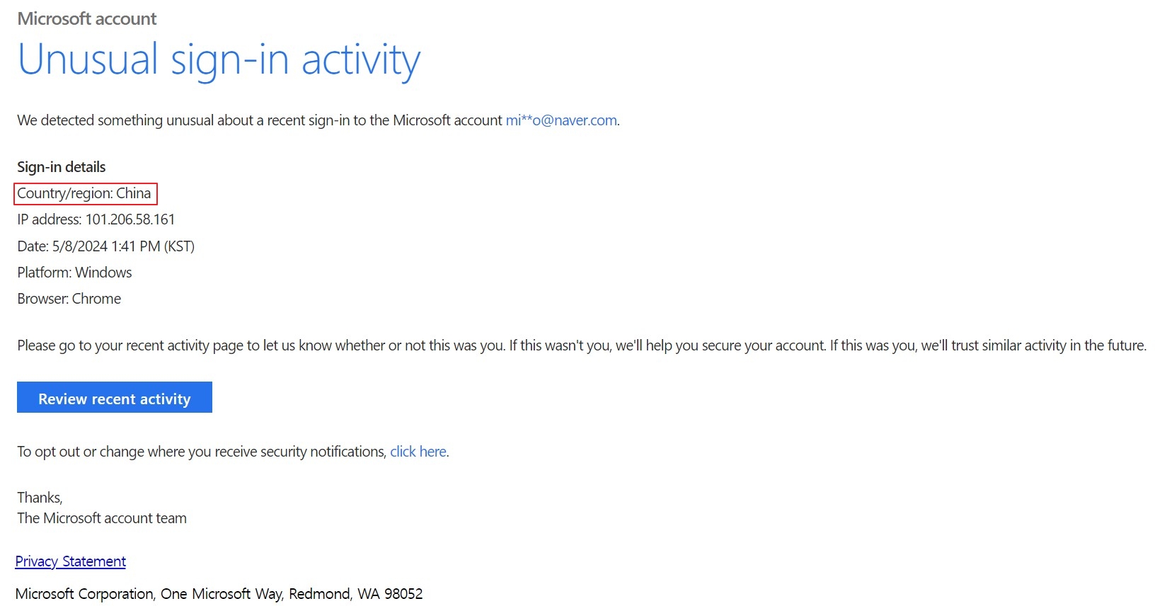 MS에서 온 메일인데 지역이 중국(China)에서 접속한 흔적이다.