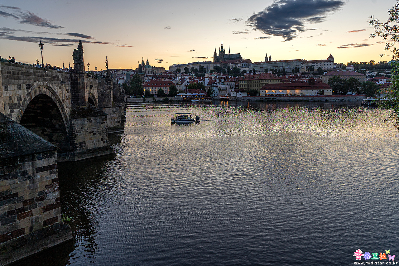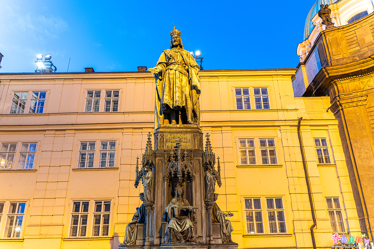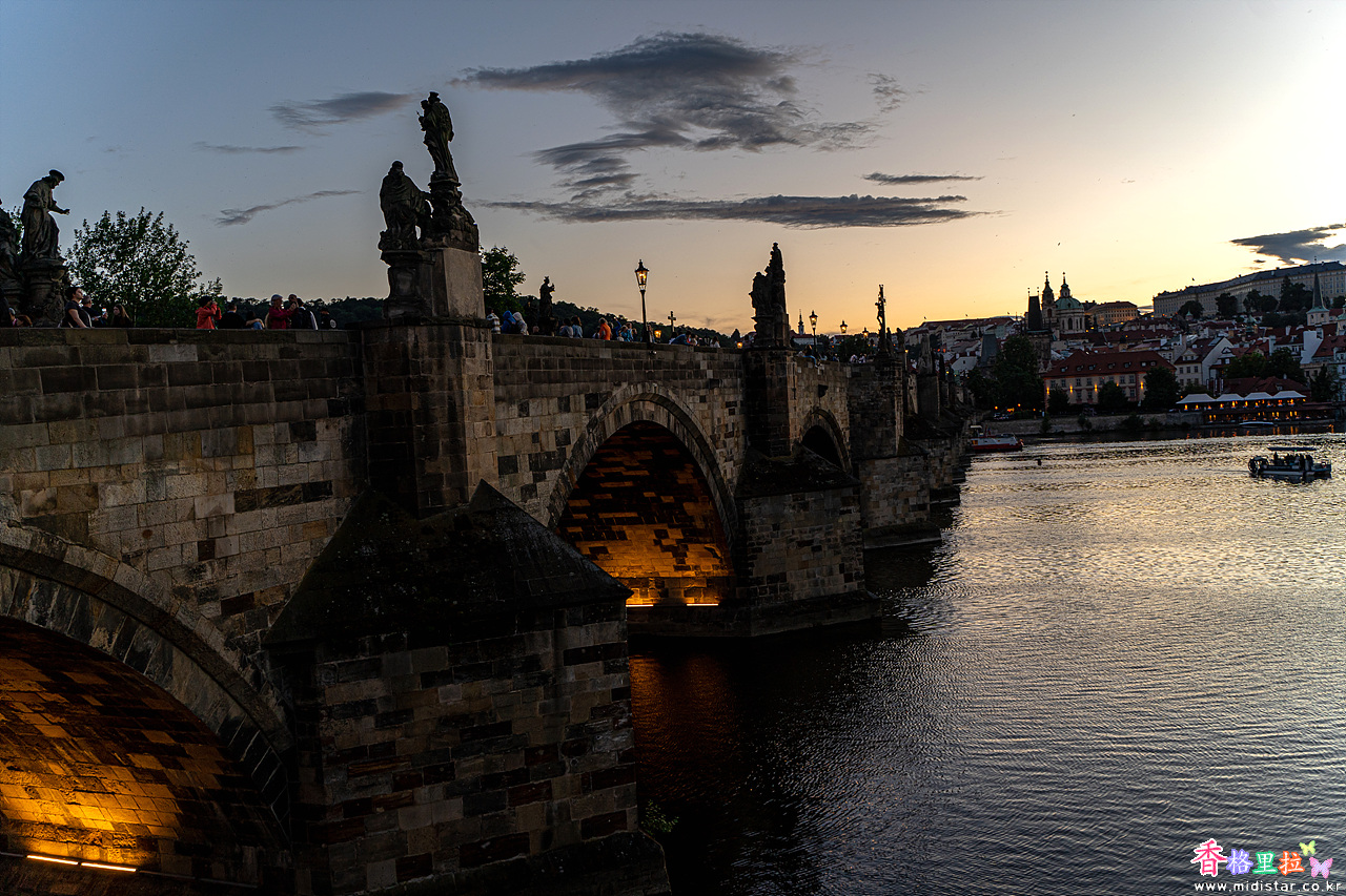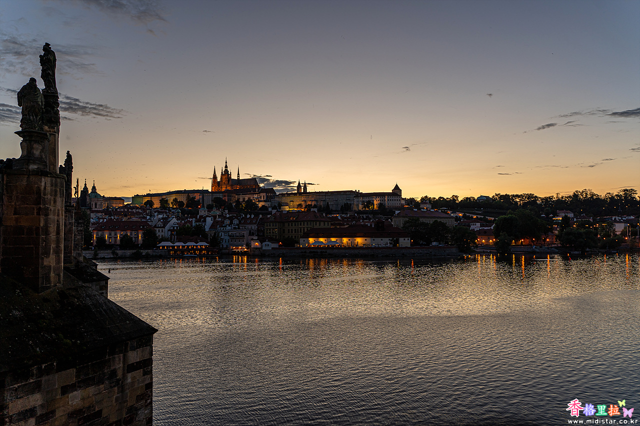 오히려 까를교 옆의 까를 4세 동상에 조명이 비추어 색이 예쁘다.