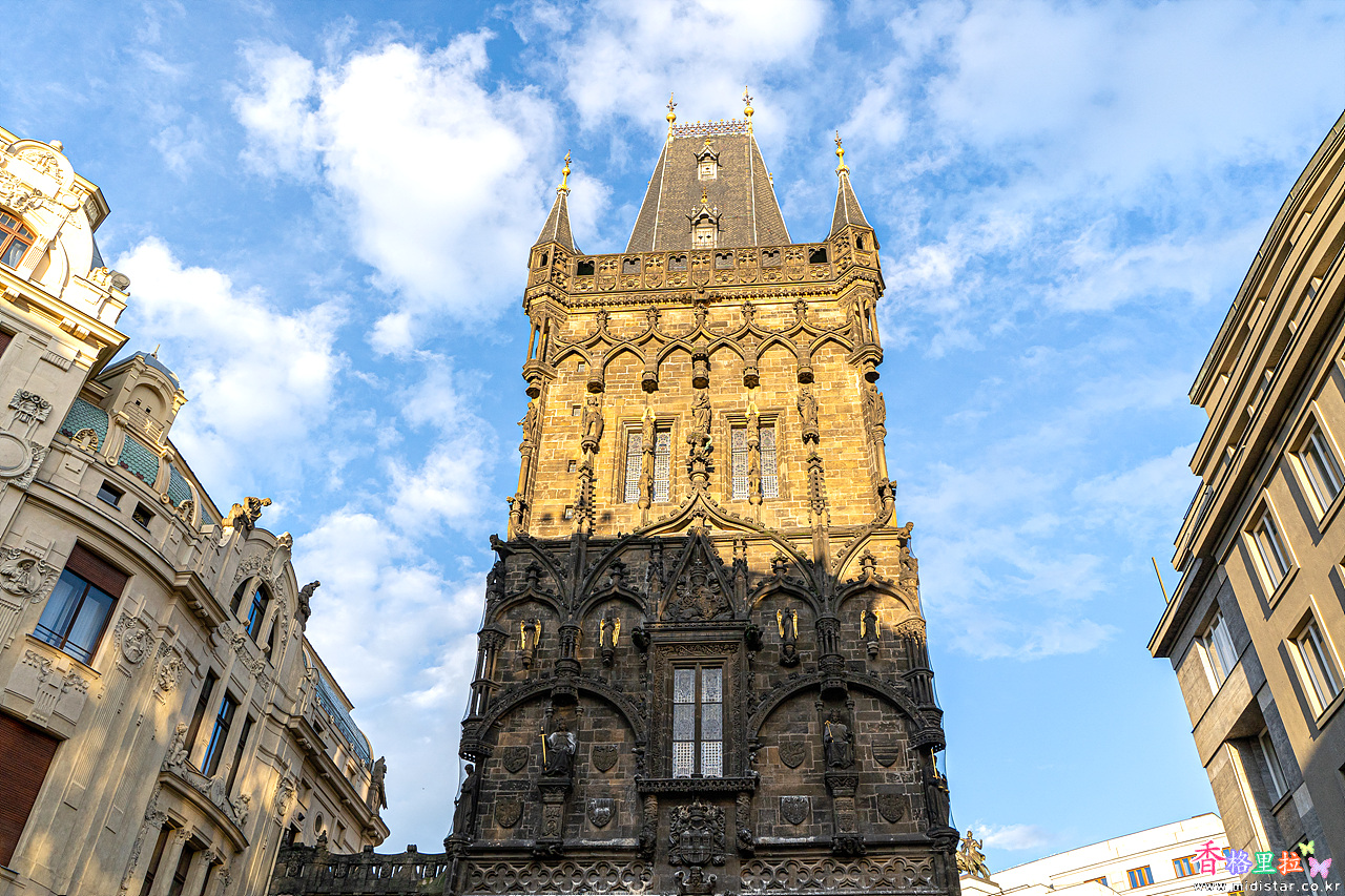 프라하역(驛)에서 남쪽으로 500m 지점에 프라하 국립박물관이 있고, 이 곳에서 다시 바츨라프 광장과 무스테크 광장을 지나면 오른쪽에 화약탑이 있다. 프라하의 구시가지와 신시가지가 나뉘는 지점으로, 옆에는 아르누보 양식으로 지어진 시민회관이 있다.