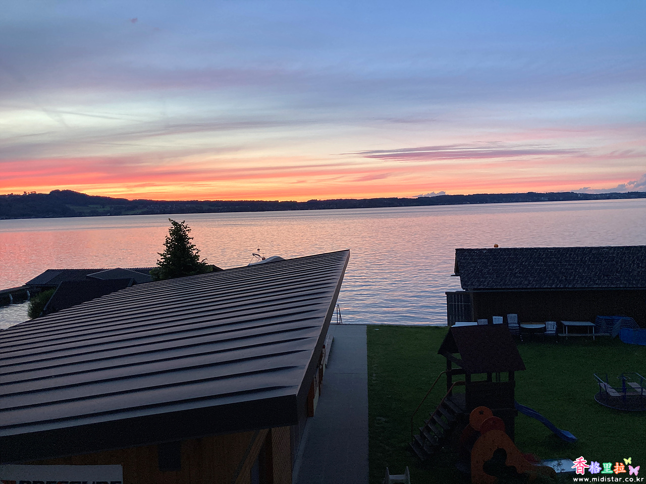 해가 지자 호수 위로 붉은 노을빛이 산 위로 띠를 둘렀다. 오랜 만에 보는 붉은 노을빛이다.