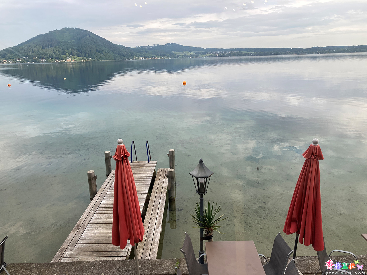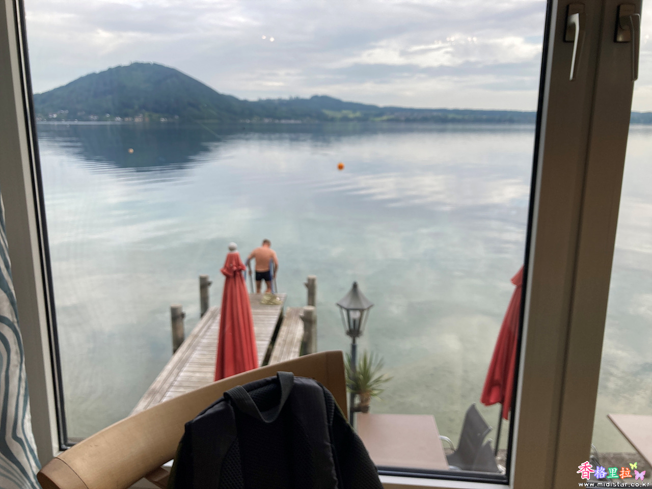 테라스에 나가 밝아오는 아침 호수 풍경을 감상한다.