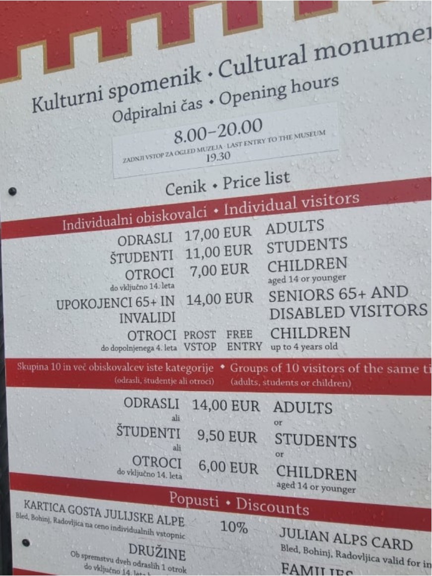 블레드 성 입장료는(2024.5. 현재)