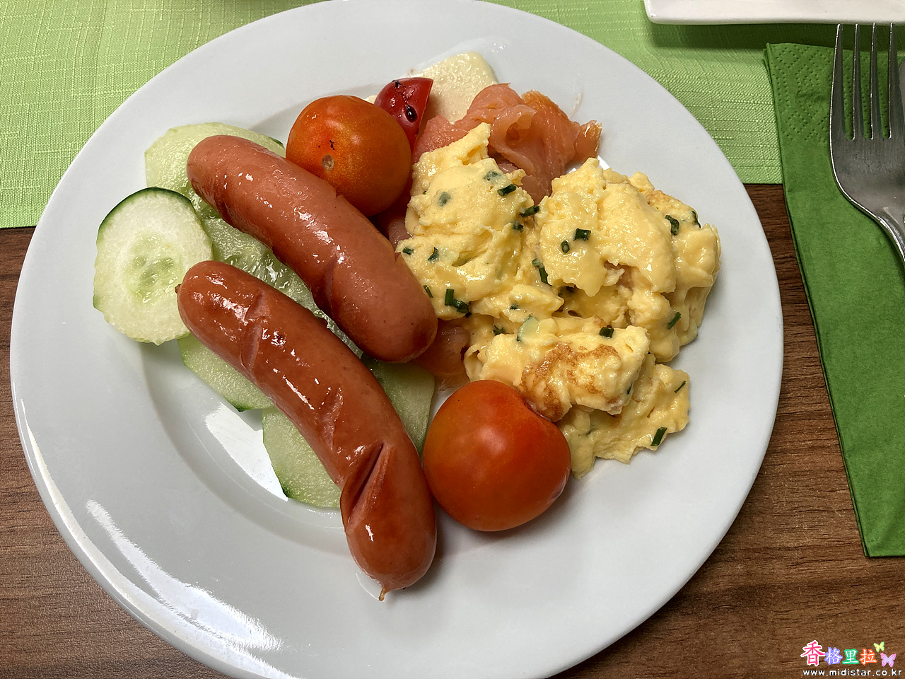 무난한 유럽식 아침 메뉴이다. 그런데 식탁이 얼마나 높은지 발이 의자 중간 받침대에 겨우 닿는다.