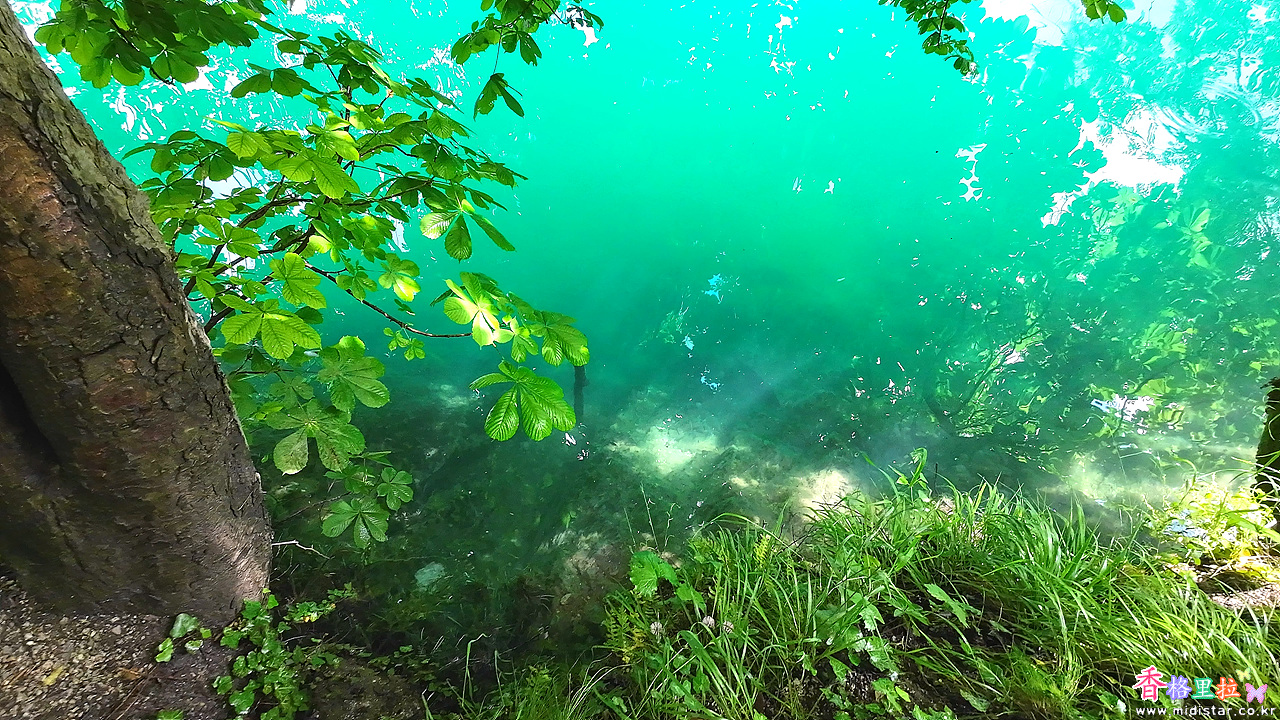 햇빛을 받은 호수의 물색이 옥색이다.