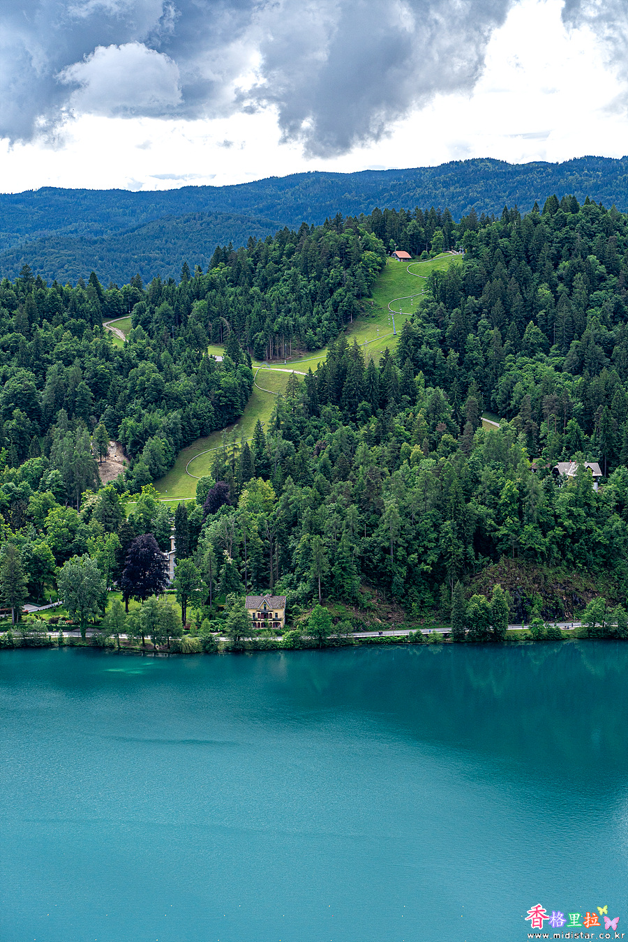 언덕길을 조금 올라가 블레드 호수가 내려 보이는 전망대에 들어서니 아래에 보이는 호수 풍경이 미쳤다.