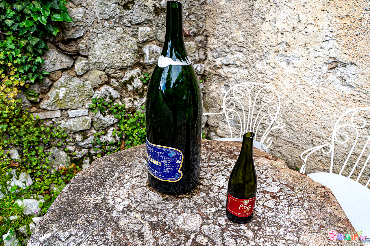 화장실 앞에 무지하게 큰 포도주병이 놓여있다.