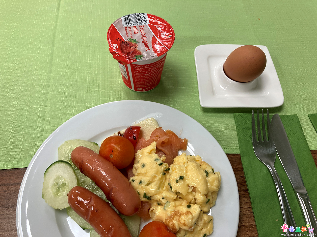 무난한 유럽식 아침 메뉴이다. 그런데 식탁이 얼마나 높은지 발이 의자 중간 받침대에 겨우 닿는다.