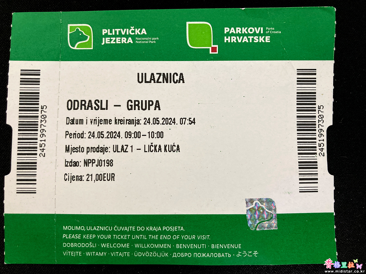▲플리트비체 국립공원(Plitvička jezera) 입장권