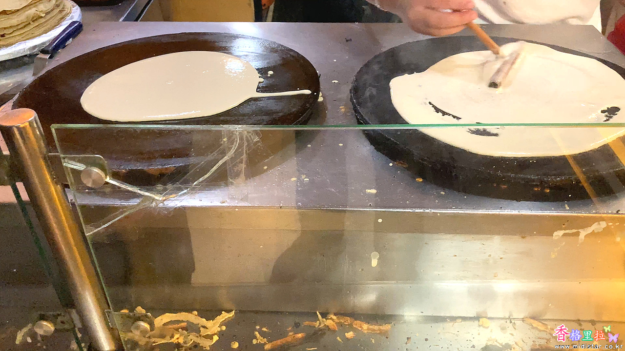 크레페를 만드는 여인의 솜씨가 좋다.