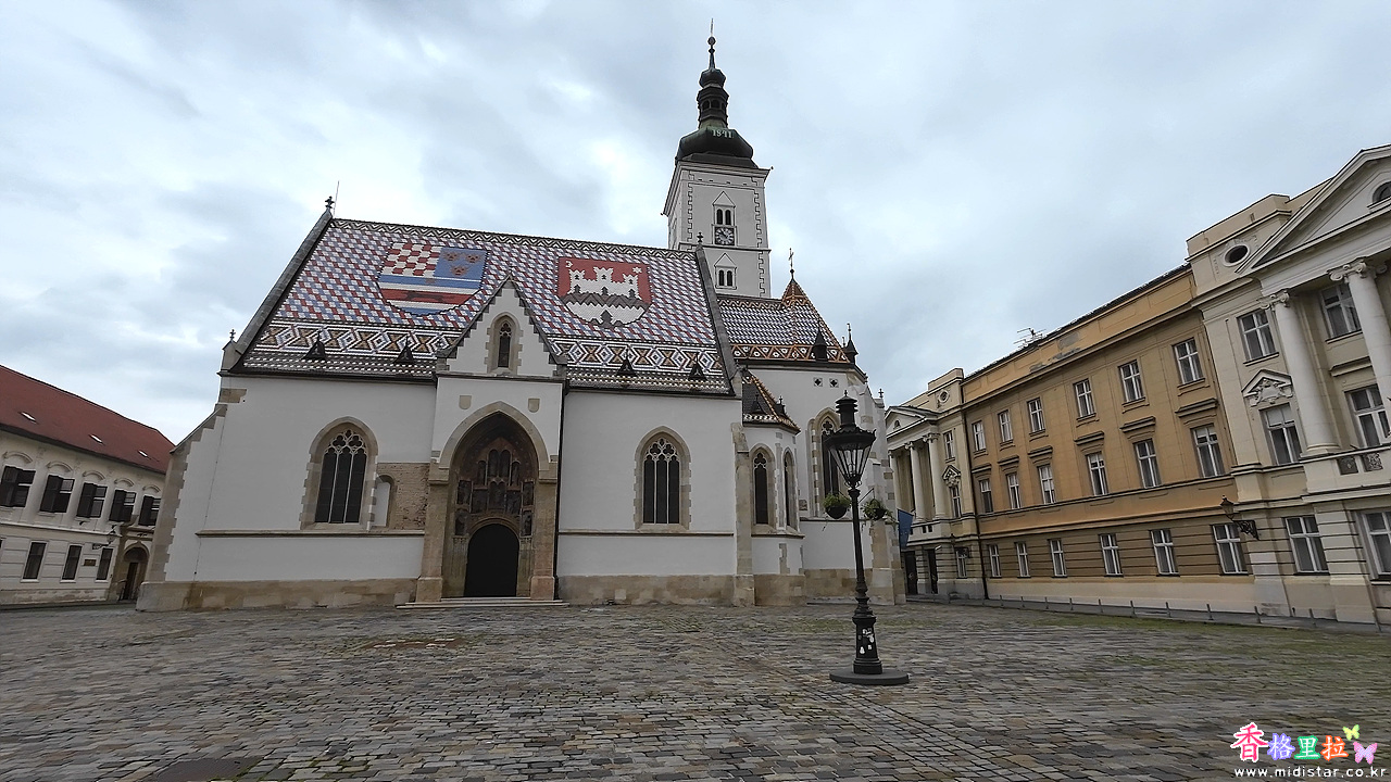 지붕의 왼쪽에는 크로아티아-달마티아-슬라보니아의 문장이, 오른쪽에는 자그레브 시의 문장이 새겨져 있어 크로아티아의 역사와 자그레브의 상징성을 동시에 보여준다. 이 타일들은 1880년에 만들어졌다.