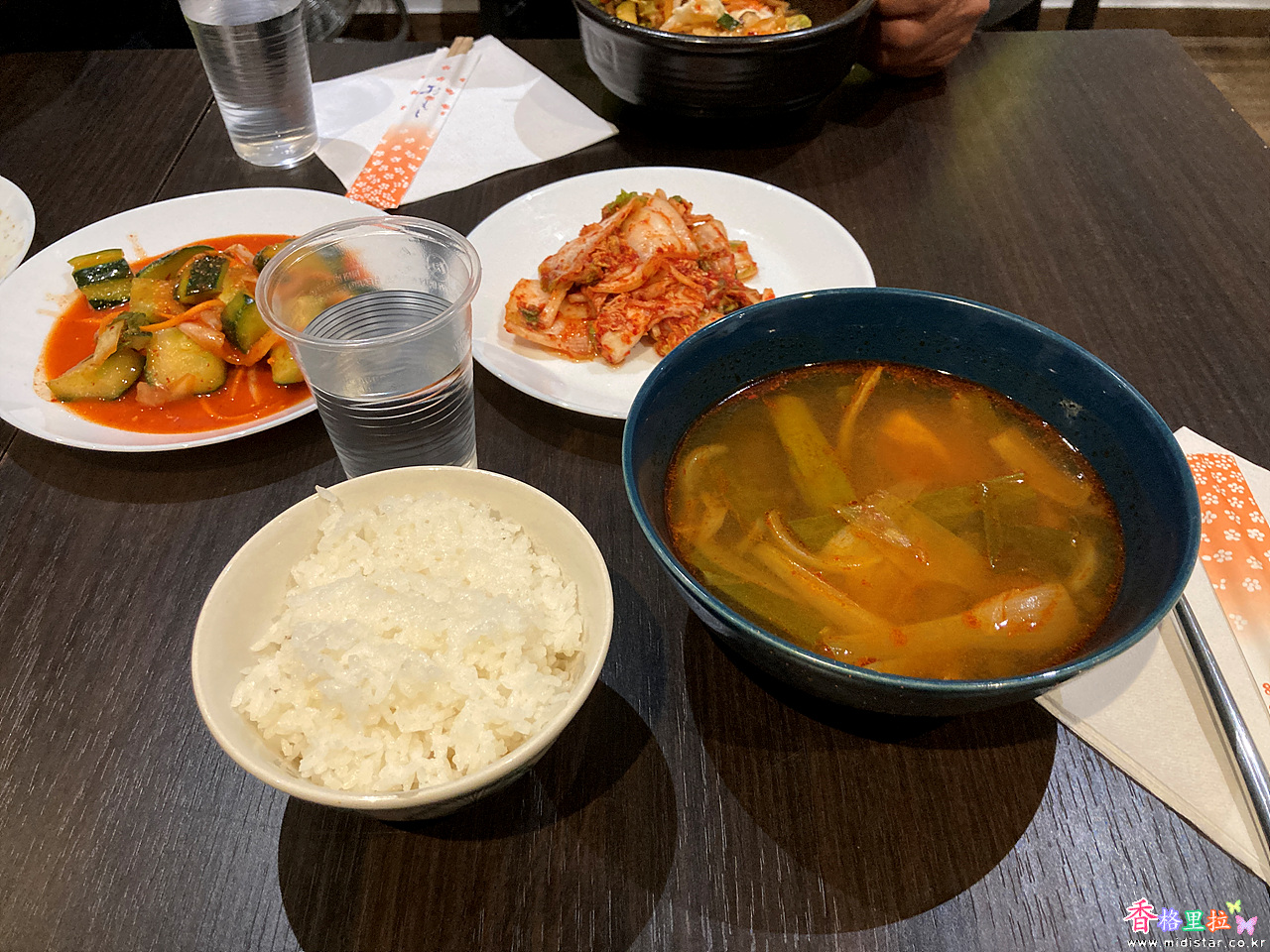 그런데 미리 차려져 있어 국물이 식어서 별로다. 아무리 한국 사람들이 빠른 거 좋아한다지만 약간 뜨거운 맛에 먹는 육개장이 식어버리도록 미리 차린다는 건 좀 아닌 것 같다.