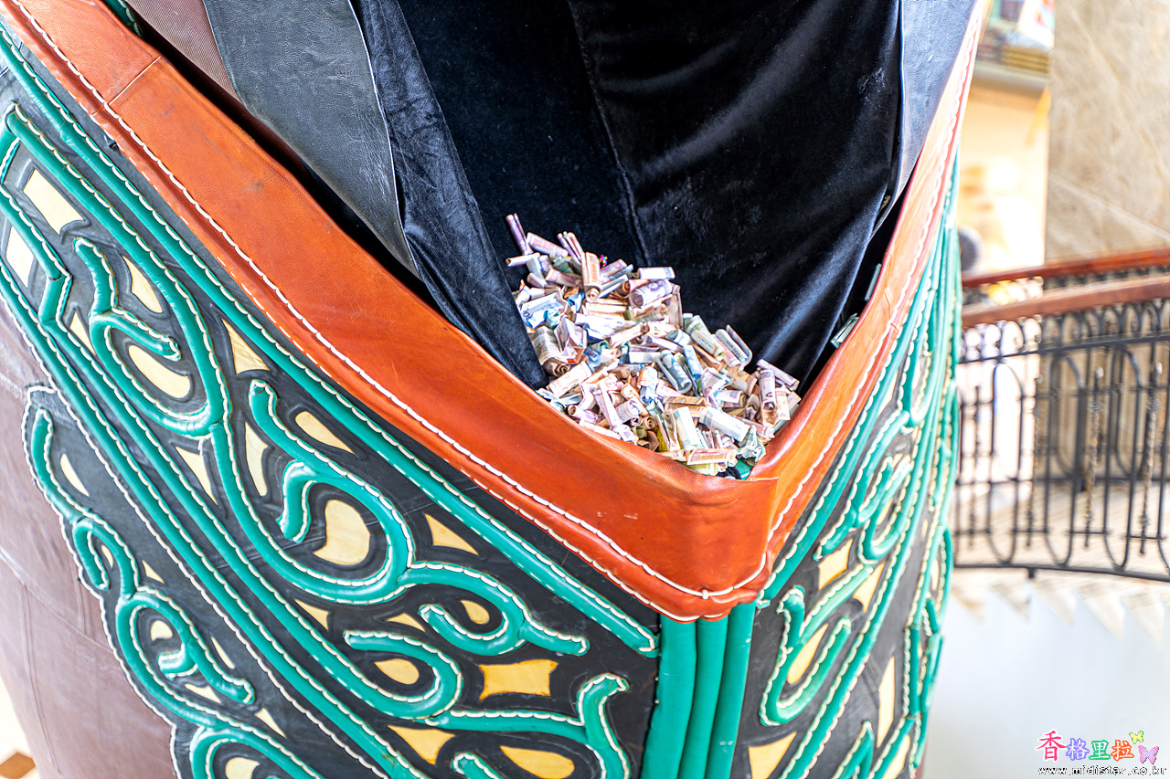대형 장화의 끝 부분에 사람들이 돈을 던져 놓았다.
