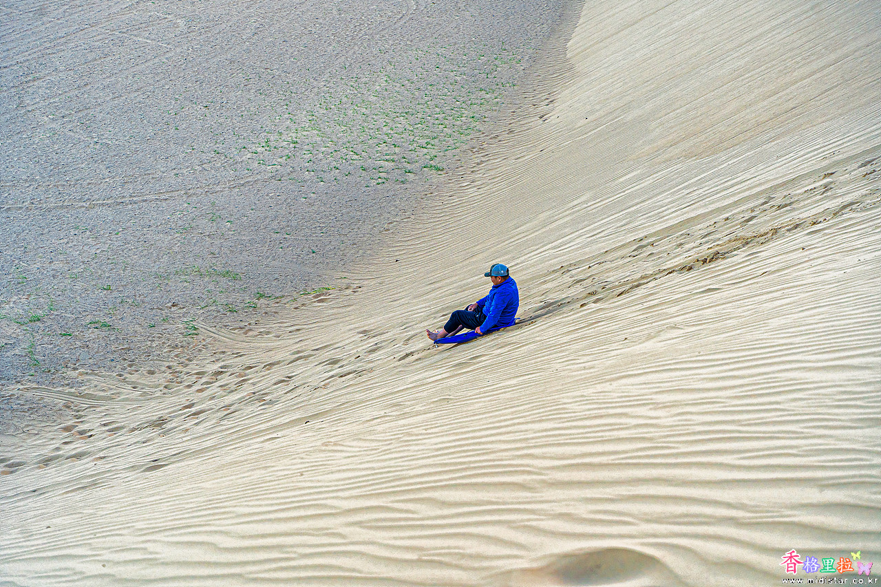 우리 버스 기사가 버스에 싣고 다니던 모래썰매를 가져와 썰매를 타는데 미끄러져 내려가질 않는다.
