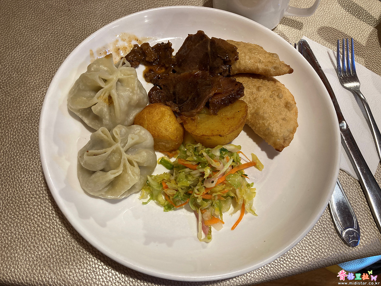 1인당 한 접시에 만두, 감자, 고기를 정갈하게 차려주어 맛있게 먹었다.