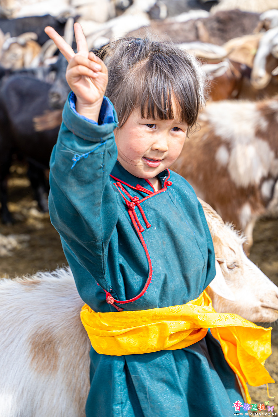 녹색옷을 입은 여자이이가 염소 한 마리를 붙잡고 놀고 있었는데 어릴 때부터 같이 크고 자라서 염소가 이 아이한테만 도망가지 않고 같이 놀아준다고 한다.