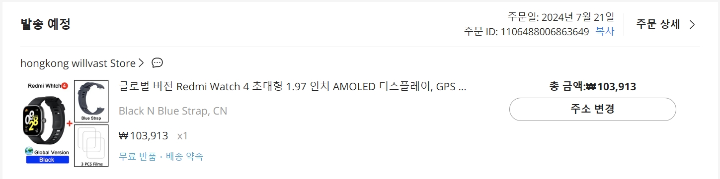 나는 알리에서 액정 필름 3장과 스페어 밴드 1개를 포함한 세트 제품을 103,913원에 해외 직구로 7월 21일에 주문 8월 1일 받았다.