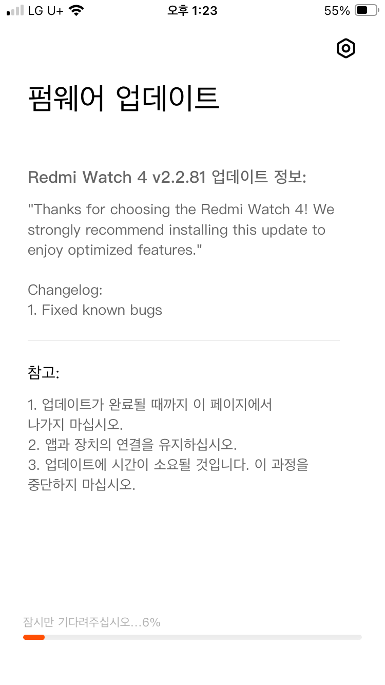 ▲Redmi Watch 4의 펌웨어 펌웨어 업데이트 중