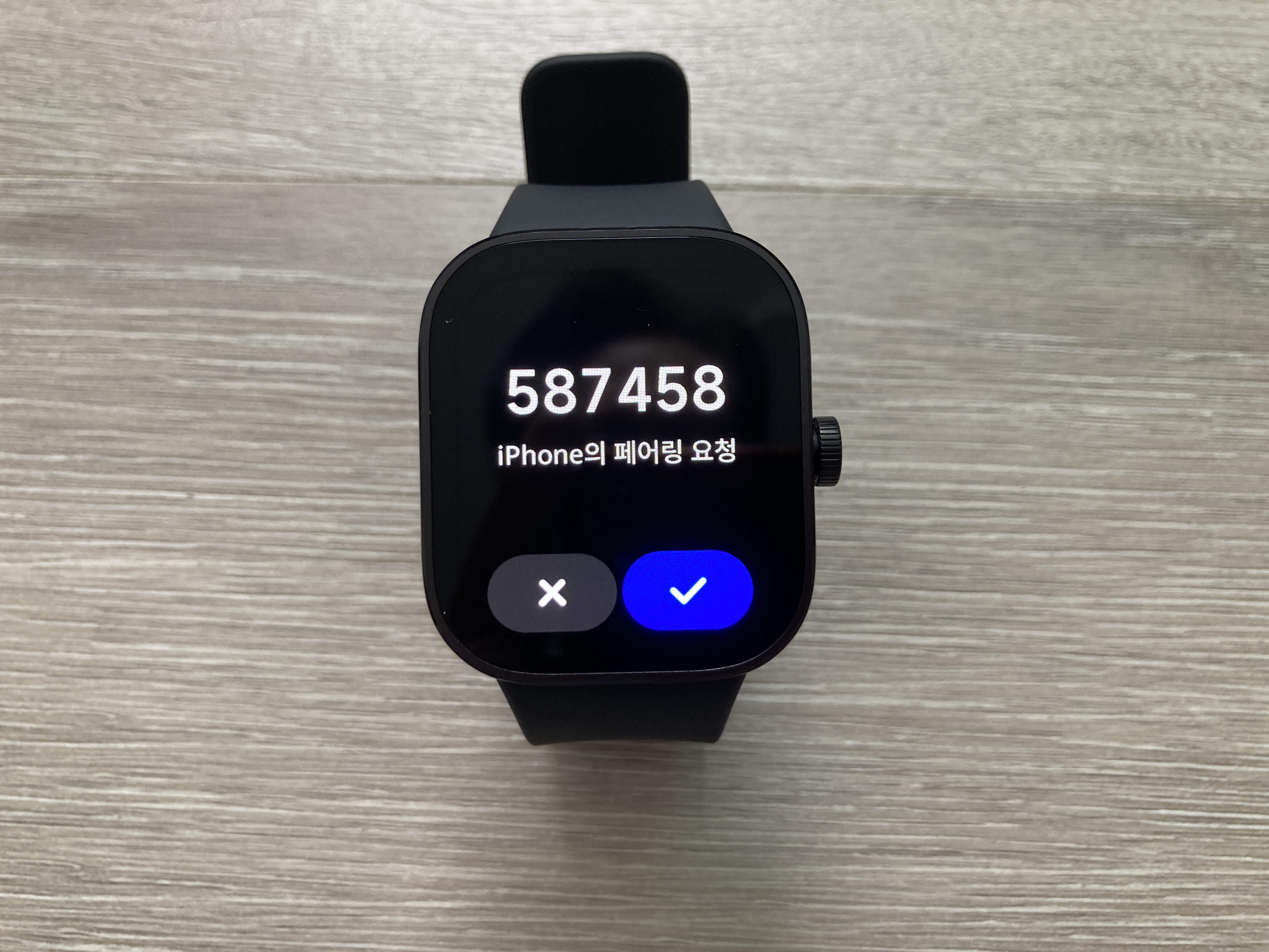 레드미워치 4에서 iPhone의 페어링 요청 화면이 나오는데 파란버튼을 선택해준다.