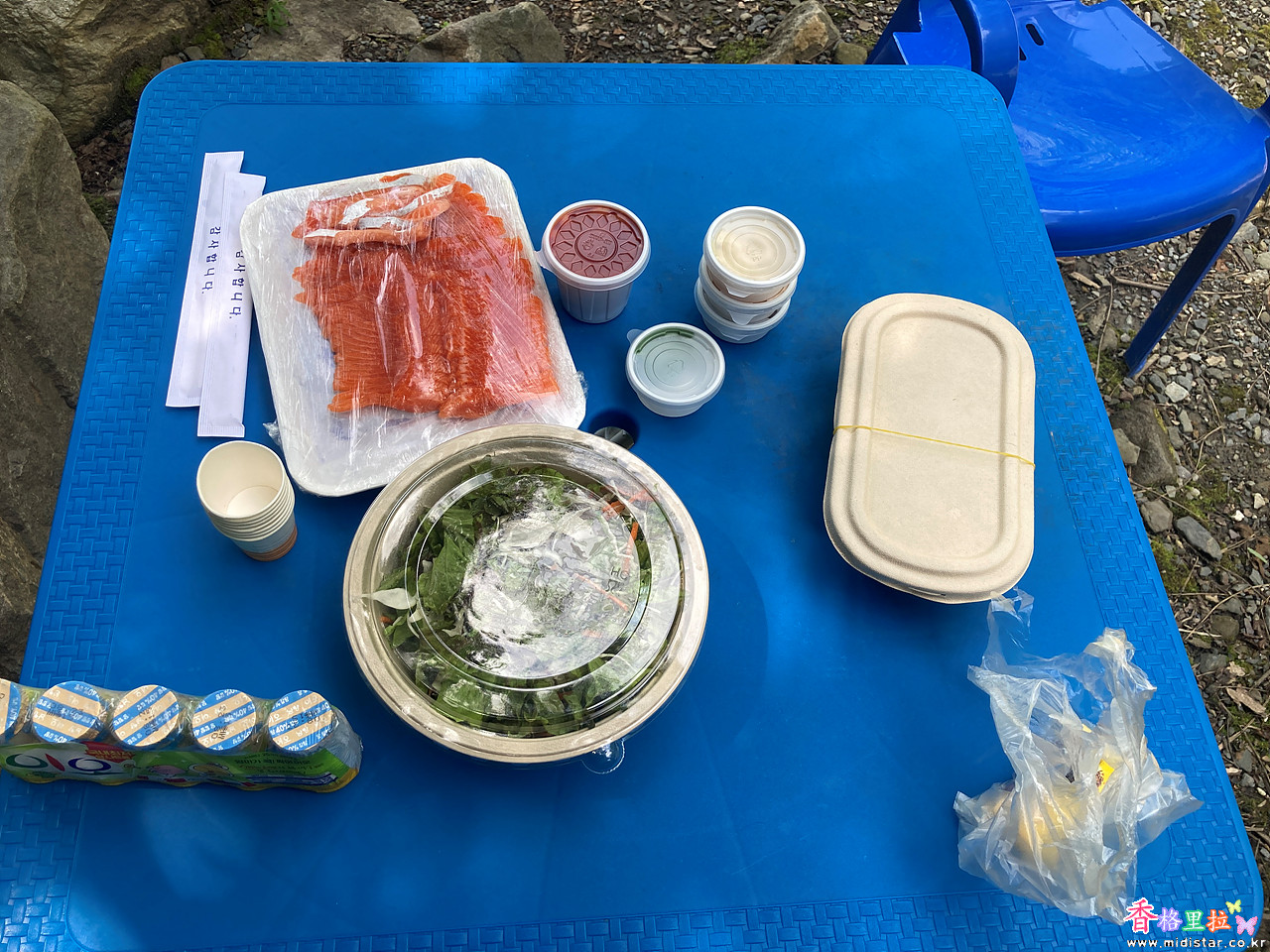 농막은 뜨거운 햇볕에 달궈저 있어 들어가지 못해서 물가 그늘에 자리를 잡고 송어회 한 점에 소주 한잔 들이켠다.
