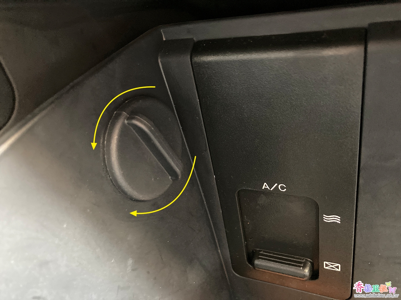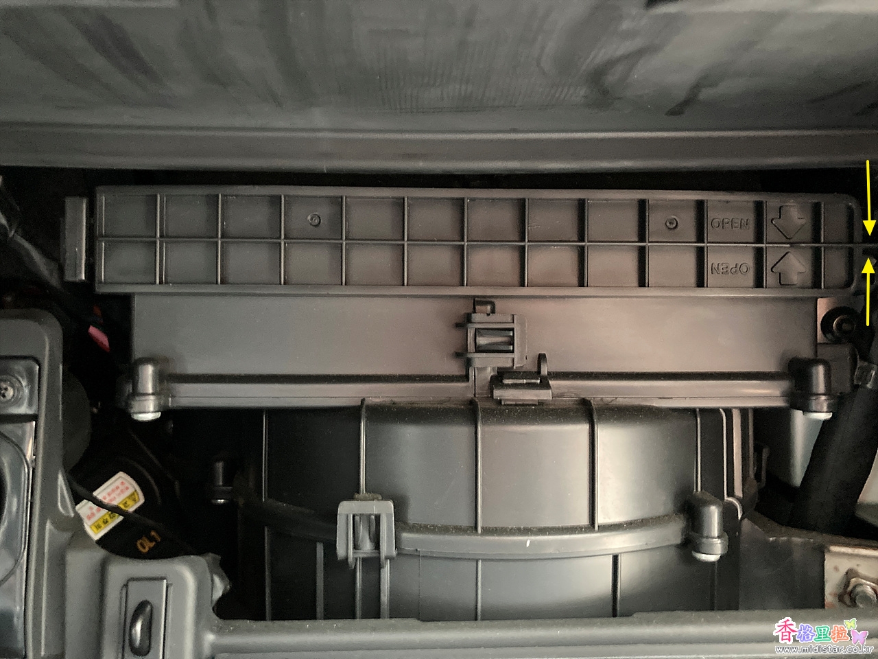 조수석 글로브 박스를 열고 양쪽의 고정용 플라스틱을 돌리면서 잡아당기면 글로버 박스가 아래로 열린다.