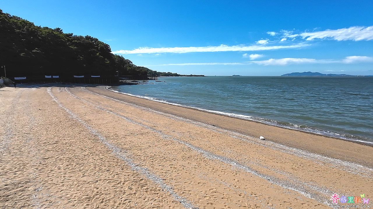 특이하게 운동장에 하얀 줄 그어진 것처럼 하얀 띠가 있었는데 밀물 썰물 때마다 조개껍데기가 밀려와서 자연스럽게 만들어진 하얀 띠가 일부러 그려놓은 줄 같이 보인다.