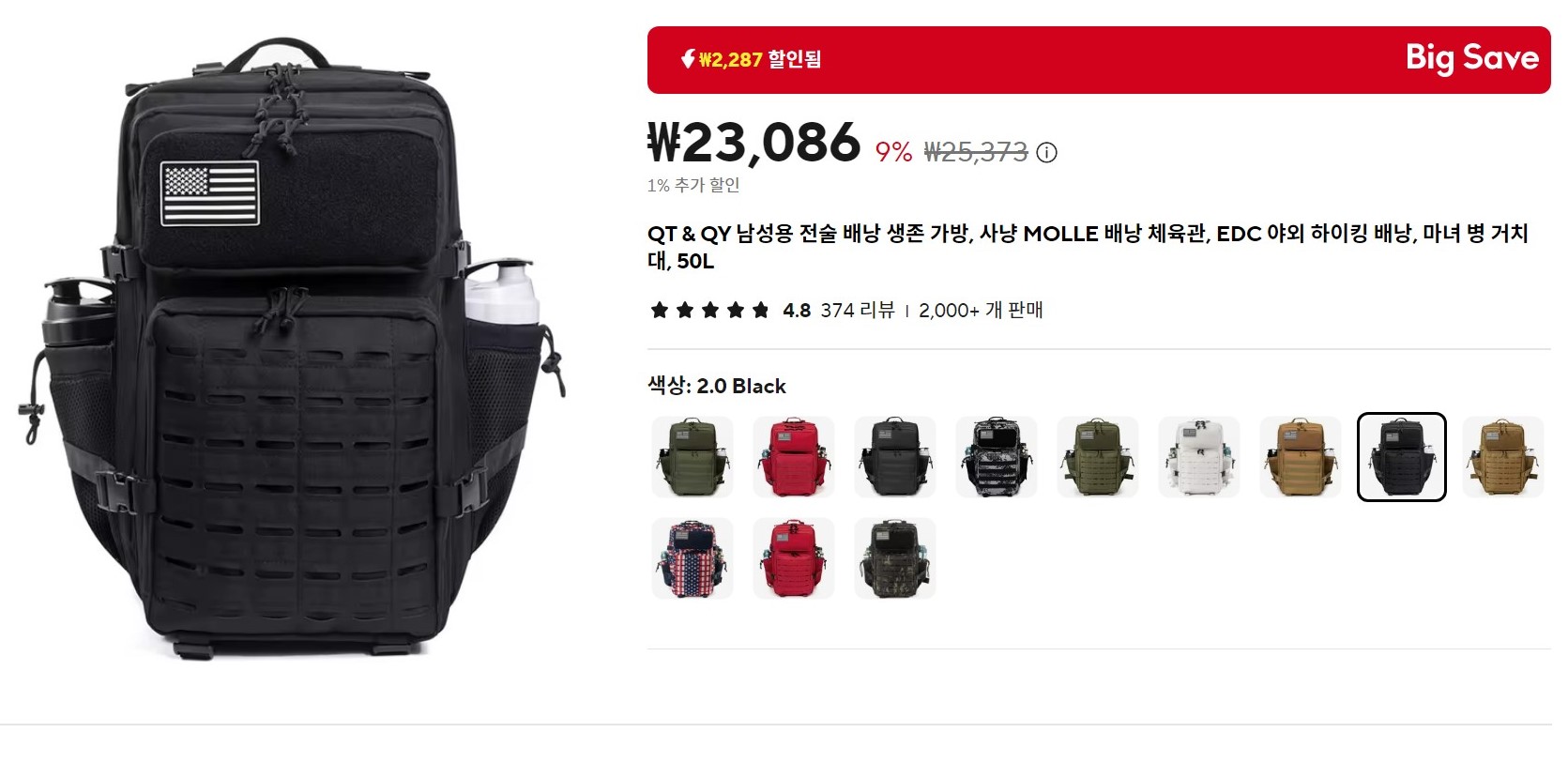 배낭 양옆에 물병을 넣을 수 있는 주머니가 있다. Ali에서 판매하는 배낭 중에 옆에 물병 주머니가 없는 제품도 있으므로 자세히 살펴보아야 한다.