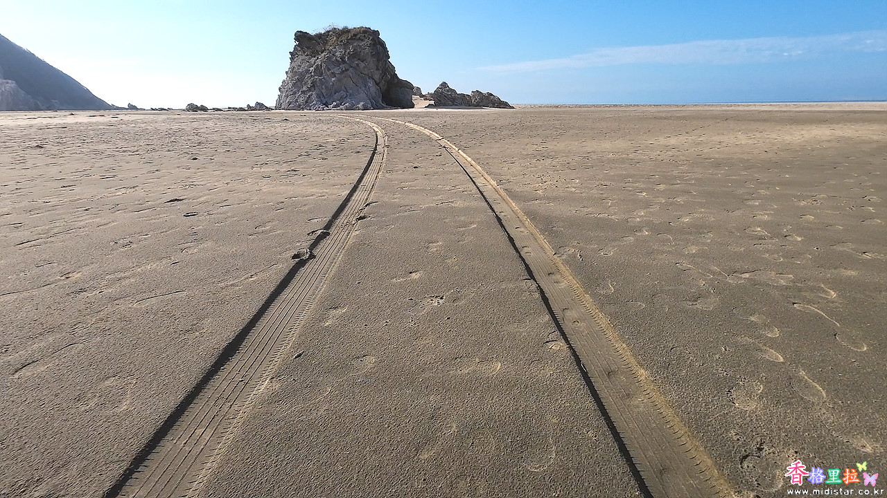 자동차가 달려도 빠지지 않을 정도로 단단한 모래톱위를 지나간다.