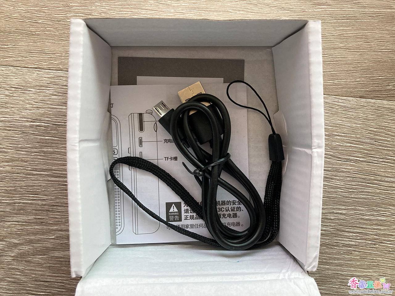 구성품은 FM 라디오, 끈, USB 케이블, 사용설명서가 들어있다.
