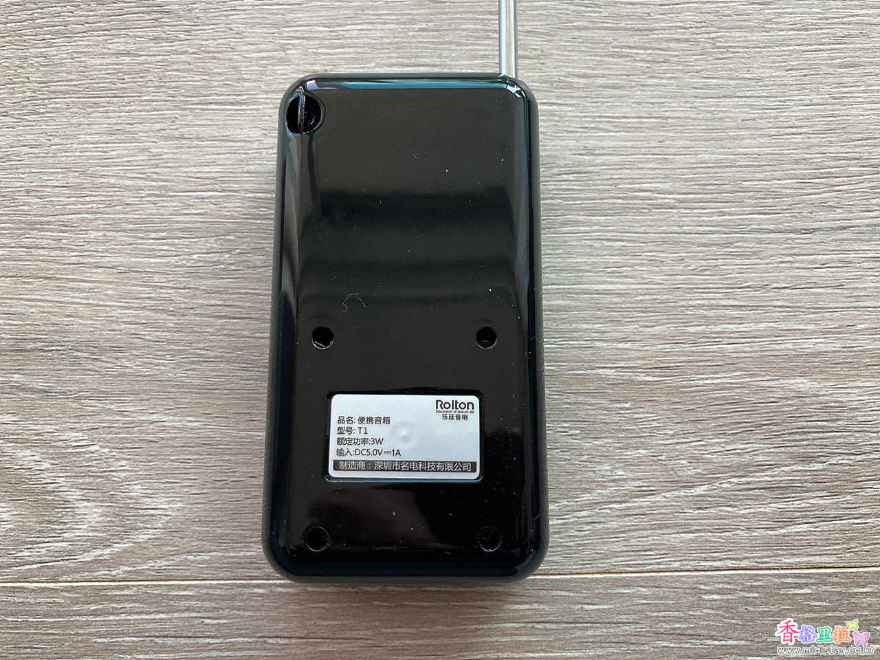 상단에 볼륨, 램프, 이어폰 단자, 안테나가 있다.