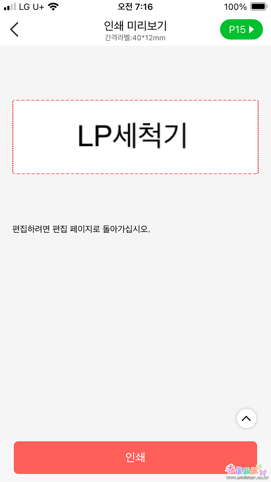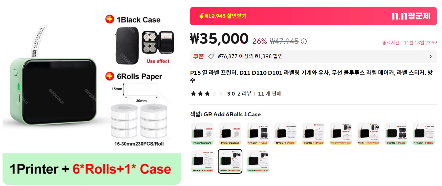 P15 라벨 프린터는 Case + 6 Rolls 용지 셋트품을 35,000원에 구입했다.